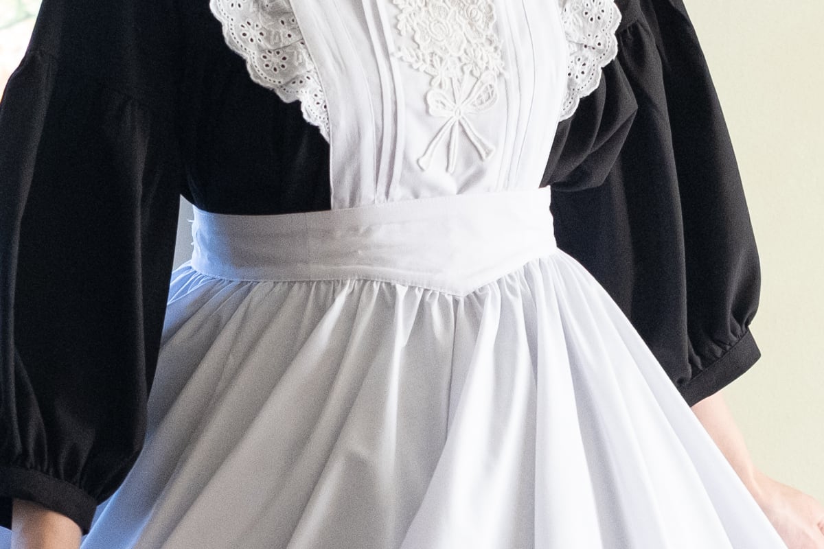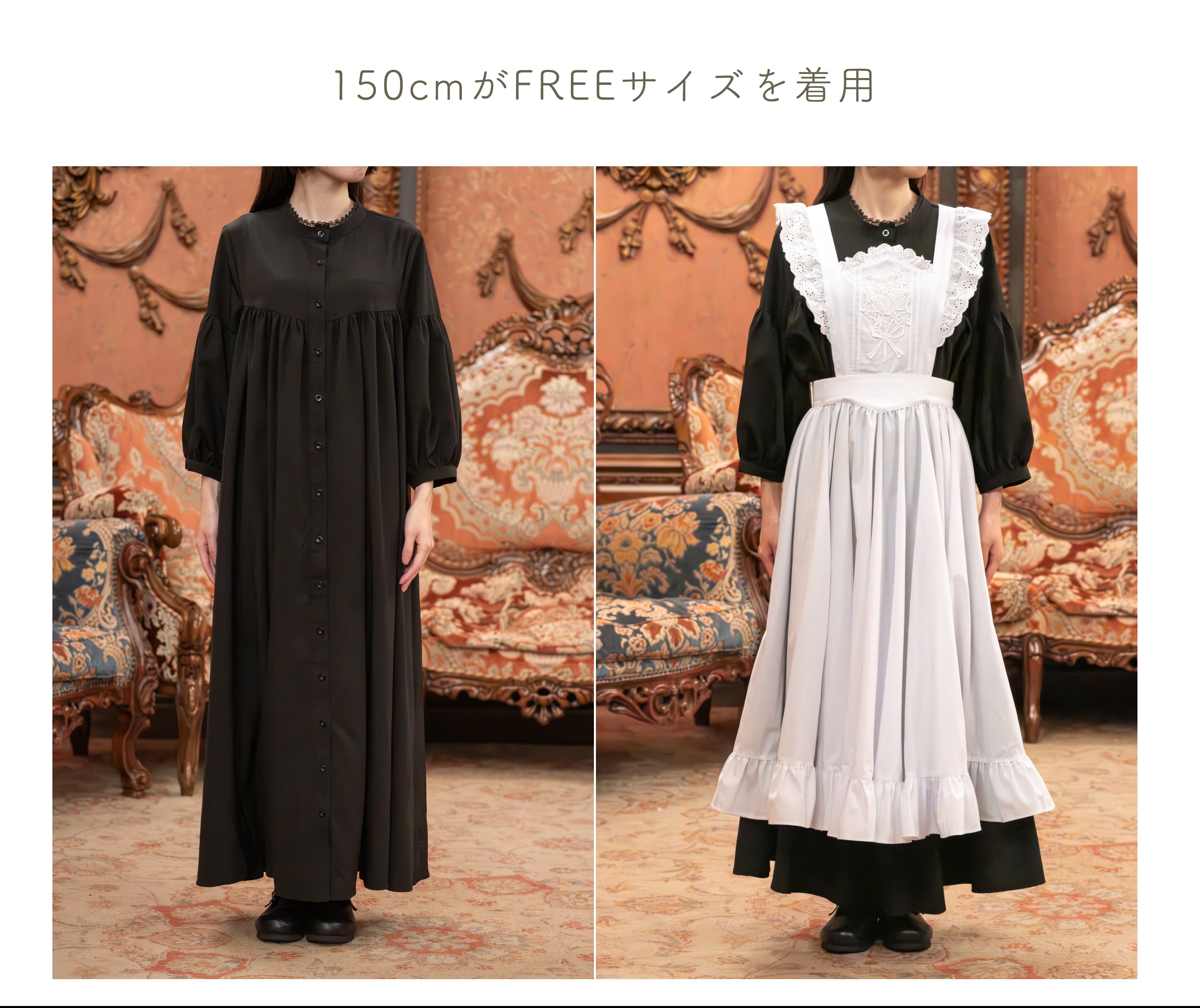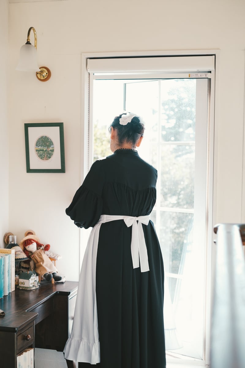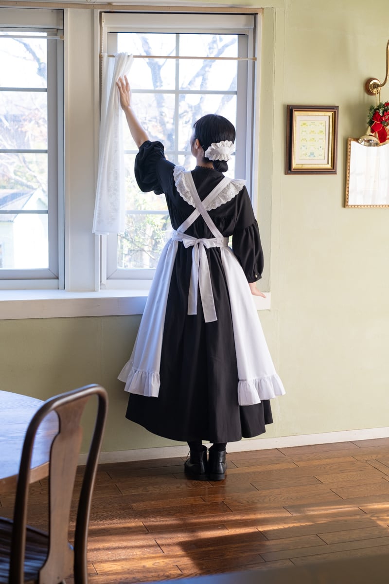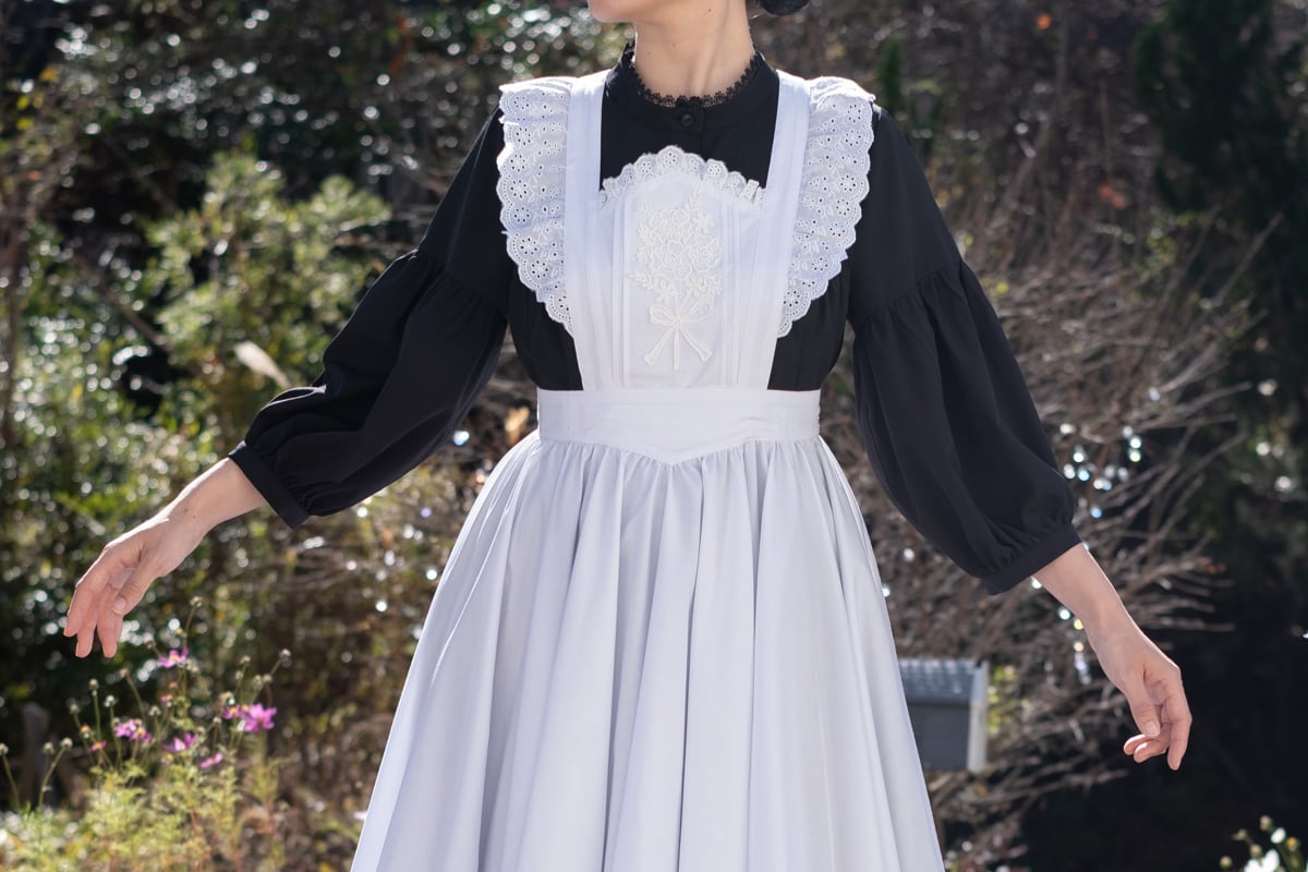 本品は「メイドのホテル」の制服として仕立てた特別な一着でございます。格式あるお屋敷に相応しい品格を大切にしており、お屋敷で使うほか、客人の方のご自邸で使用人に着用させたり、客人の方ご自身がお召しになってお楽しみいただいたりすることを想定してご用意いたしました。