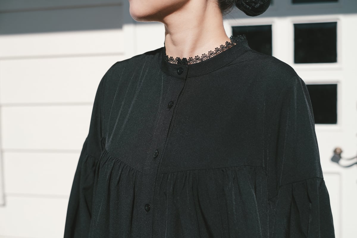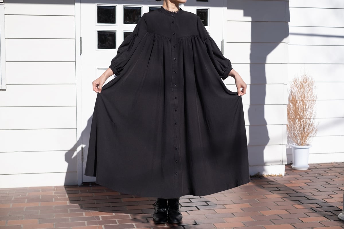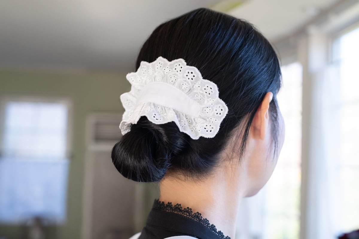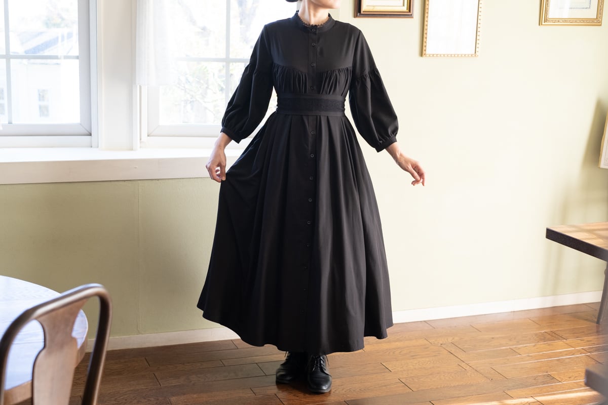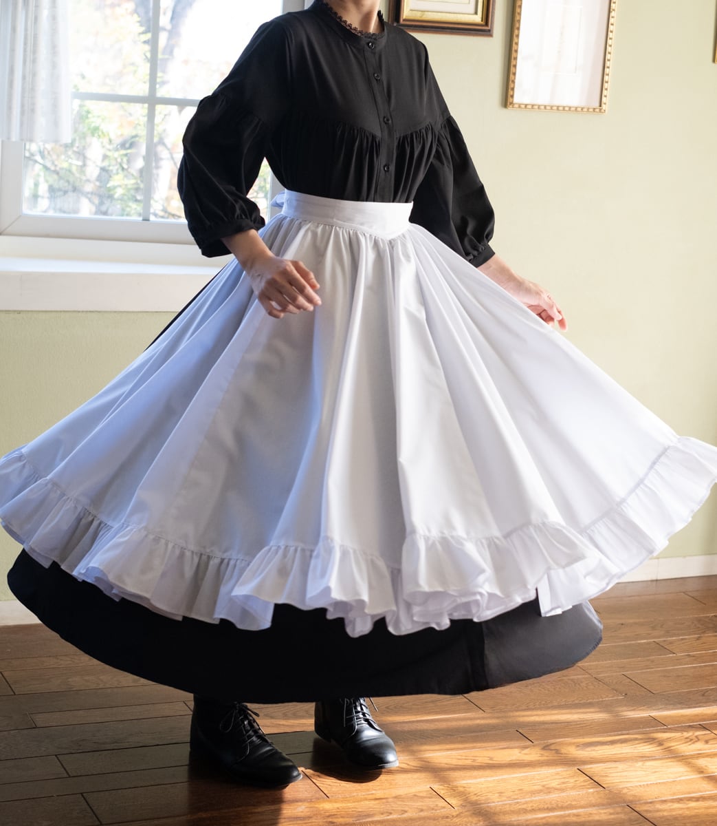 本品は「メイドのホテル」の制服として仕立てた特別な一着でございます。格式あるお屋敷に相応しい品格を大切にしており、お屋敷で使うほか、客人の方のご自邸で使用人に着用させたり、客人の方ご自身がお召しになってお楽しみいただいたりすることを想定してご用意いたしました。